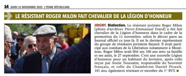 Roger Milon, ancien résistant du Groupe Bayard vient d’être décoré Chevalier de la Légion d’Honneur. Cette distinction rend hommage à un homme d’une grande valeur,