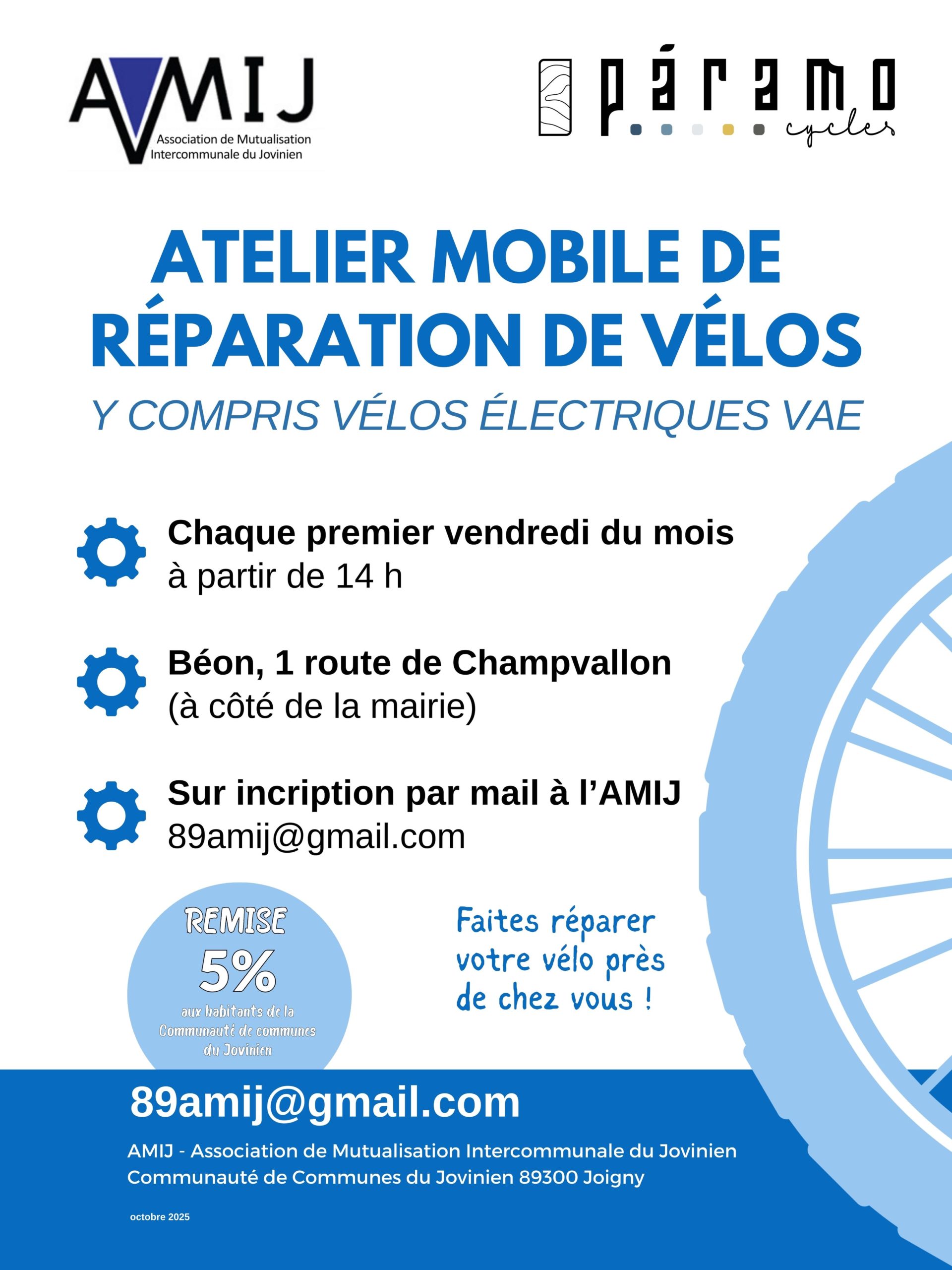 L’AMIJ, l’association de mutualisation intercommunale du jovinien, propose aux habitants de la Communauté de Communes du Jovinien de bénéficier d’un atelier mobile de réparation de vélos animé par Paramo Cycles. Vous pouvez y faire réparer votre vélo près de chez vous, quel qu’en soit le type (classique ou électrique).